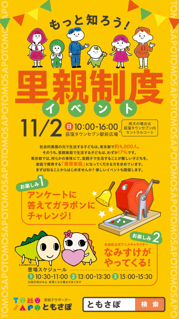 里親制度普及啓発イベントになんとあの人気の杉並区公式アニメキャラクターのなみすけがやってきます。